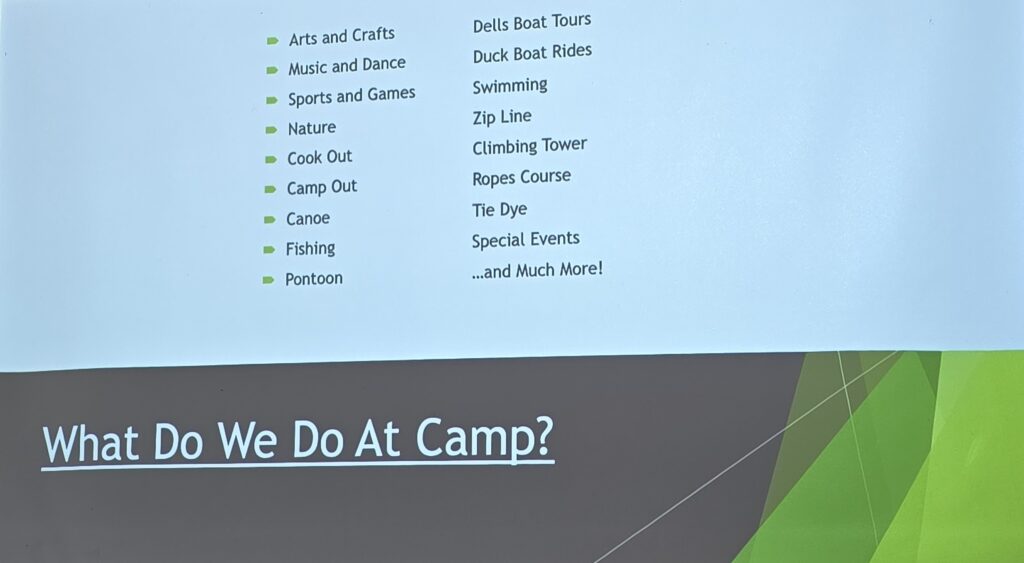 Kiwanis member Tom Neumann asked, “Where is Camp Wawbeek?” Carlee responded, “It is on the fast Eastern side of Wisconsin Dells, off of highway 13.