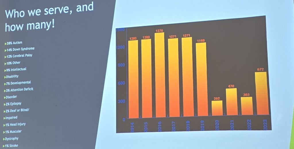 Jenny Turco introduced the day’s speaker, Carlee Fosco. Carlee is the Camp Wawbeek Executive Director. Camp Wawbeek is a pair of year-round retreat camps for children and adults with disabilities. Carlee has been associated with the camp in some form for a decade. She lives on camp most of the year.