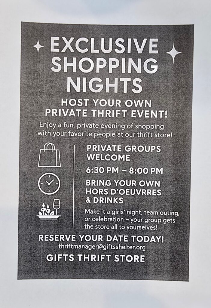 April Wright introduced the day’s speaker, Holly Shrum. Holly is part of the leadership team at the GIFTS Men’s Shelter’s Thrift Store. The store’s motto is ‘turning second hand into second chances.’ Among Holly’s many initiatives for the store, a big one is the ‘Private Parties,’ private thrift events for your group or organization to raise funds. She recently assisted with a 75 member bible study group that raised $1,500!