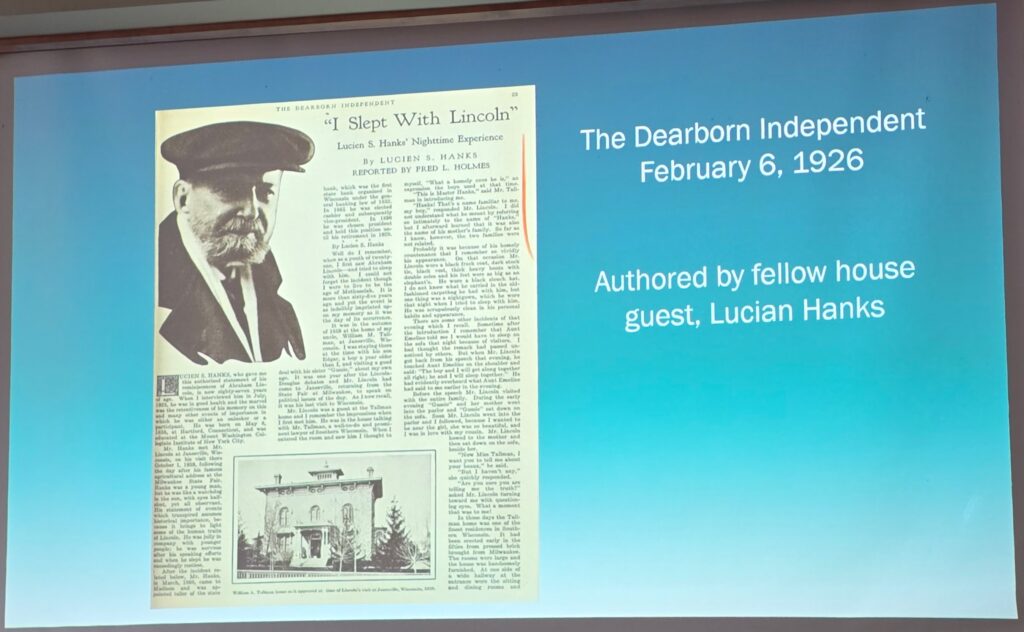 When visiting, Lincoln ‘dropped in’ on the Tallmans. Emeline Tallman was heard to say, “I shall have to find a place for Lucian.” Lucian was the Tallman’s daughter’s suitor, who was staying in the guest bedroom.